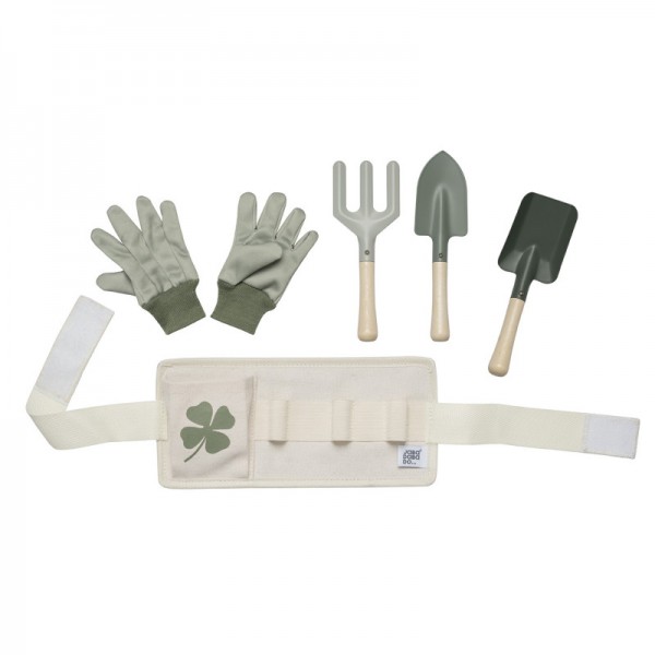 Regulowany pas z kieszonkami pozwala na wygodne przechowywanie narzędzi, dzięki czemu dziecko zawsze ma je pod ręką. Wszystkie narzędzia mają drewniane uchwyty i są utrzymane w pięknych, zielonych odcieniach, które nawiązują do natury.